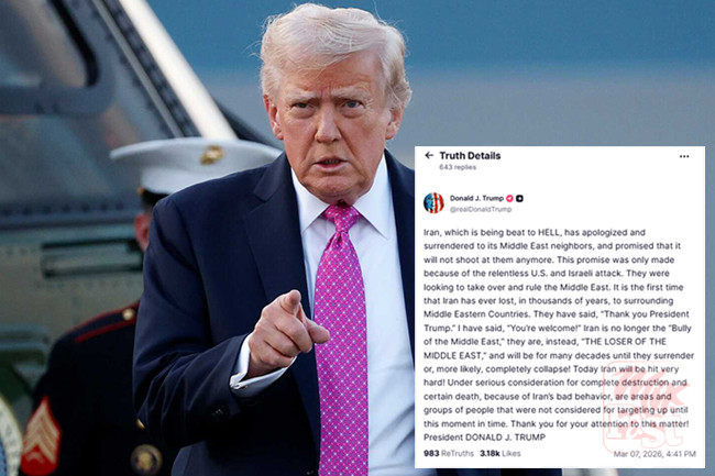 ඉරාන ජනාධිපතිවරයා මීට පෙර කළ ප්රකාශයන්ට ප්රතිචාර දක්වමින් ට්රම්ප් පවසා ඇත්තේ, ඉරානය "තම මැදපෙරදිග අසල්වැසියන්ගෙන් සමාව අයැද යටත් වී ඇති බවත්, මින් ඉදිරියට ඔවුන්ට වෙඩි නොතබන බවට පොරොන්දු වී ඇති බවත්" ය. එමෙන්ම, "මෙම පොරොන්දුව ලබා දුන්නේ අමෙරිකාව සහ ඊශ්රායලය එල්ල කළ නොපසුබස්නා ප්රහාර හේතුවෙන් පමණක්" බවත් එහිදී ඔහු සඳහන් කර තිබේ.
